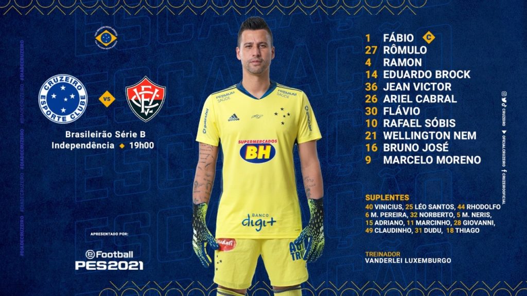 O Cruzeiro está escalado para o duelo de logo mais diante do Vitória no estádio Independência. Para o duelo o técnico Vanderlei Luxemburgo repetiu a escalação da partida diante do Brusque.