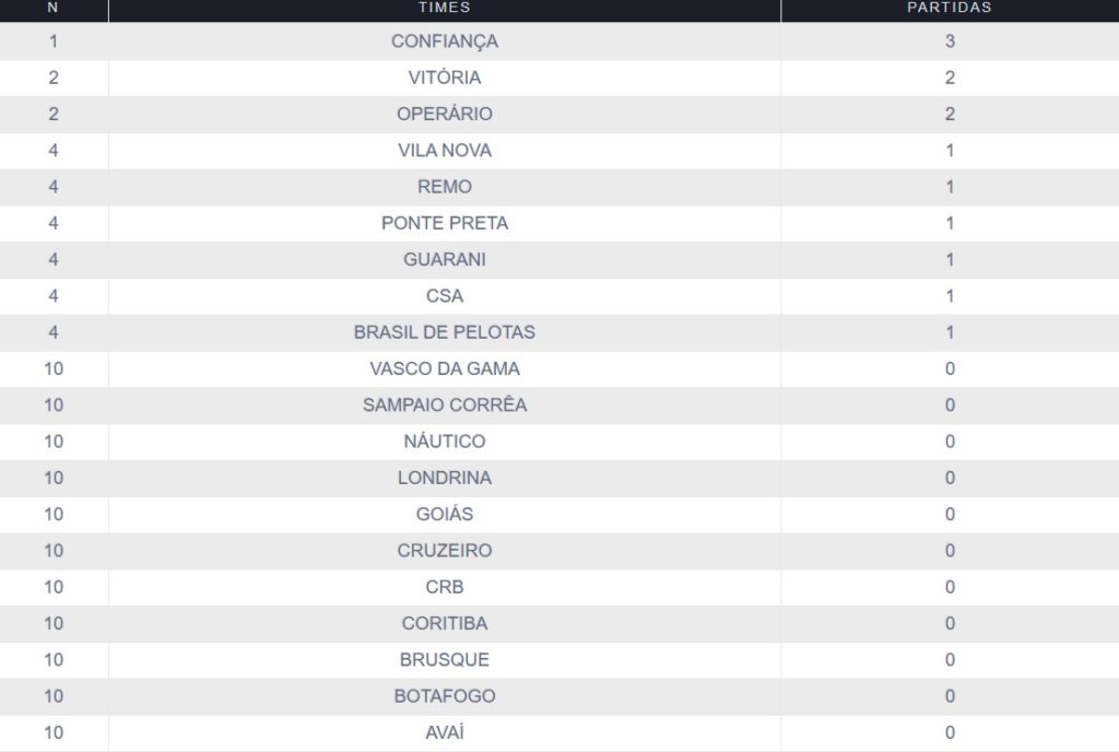 No topo da tabela, até o momento são: Confiança, Operário, Vitória, Vila Nova, Remo, Ponte Preta, Guarani, CSA e também o Brasil de Pelotas.