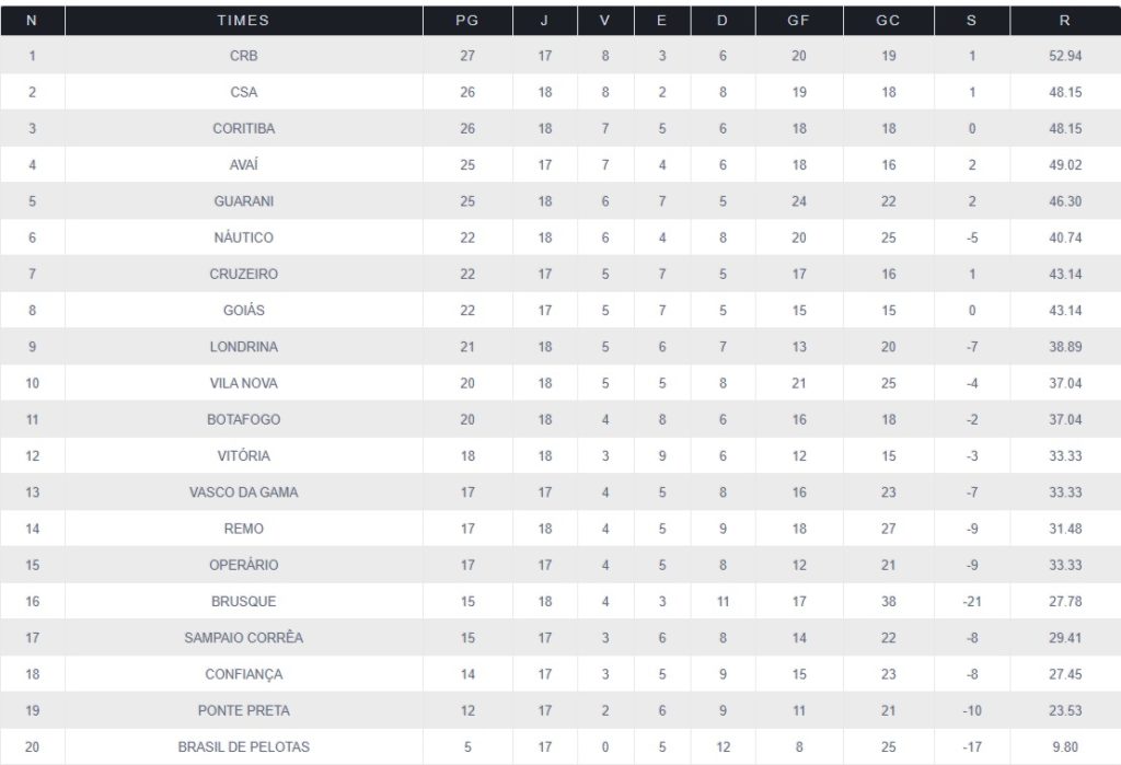 Por outro lado, as últimas colocações são: Sampaio Corrêa, Confiança, Ponte Preta e Brasil de Pelotas, que são os últimos times e os piores visitantes na competição nacional.