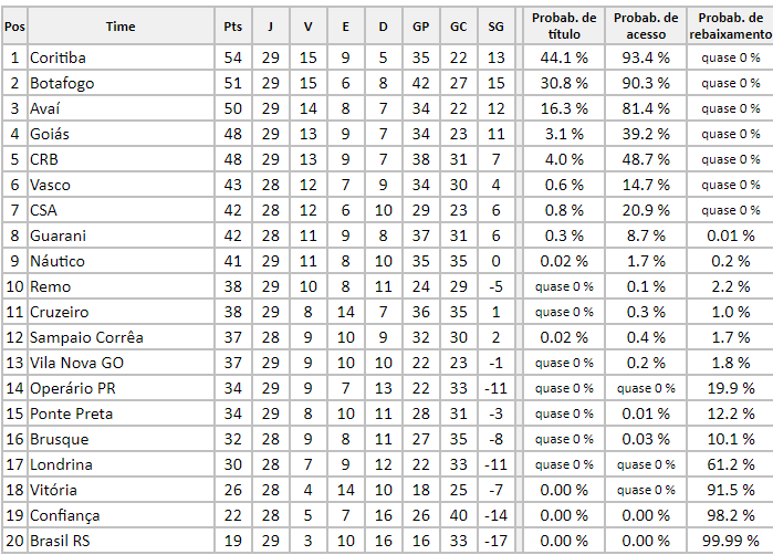 Por fim, as equipes mostram na íntegra tudo de forma detalhado e a tabela com as chances de cada equipe após os jogos que ocorreram neste final de semana pela 29ª rodada da Série B do Campeonato Brasileiro.