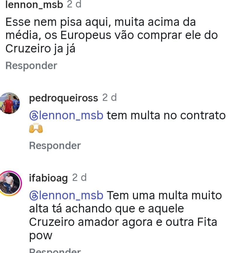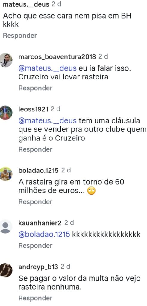Esses comentários foram tirados do perfil do Instagram Central da Toca. Torcedores temendo uma “rasteira” do Barcelona e levar o jogador, outros lembrando da multa a ser paga caso algo evolua. De todo modo uma reviravolta com ele não vindo para o Cruzeiro é possível, mas improvável nesse momento.