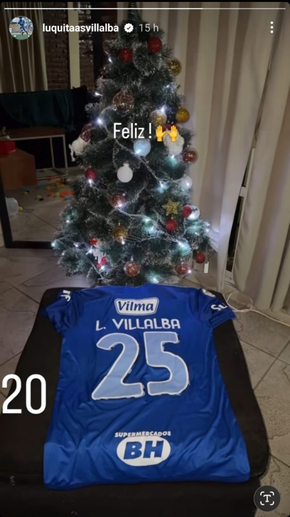 Na publicação está escrito “Feliz 2025”, com o número do ano que vem sendo representado pela camisa 25 que o jogador usa no clube celeste. O contrato definitivo de Villalba com a Raposa será válido até o fim de 2026.
