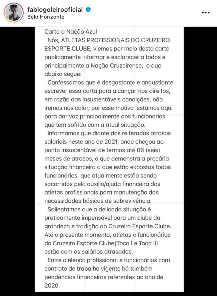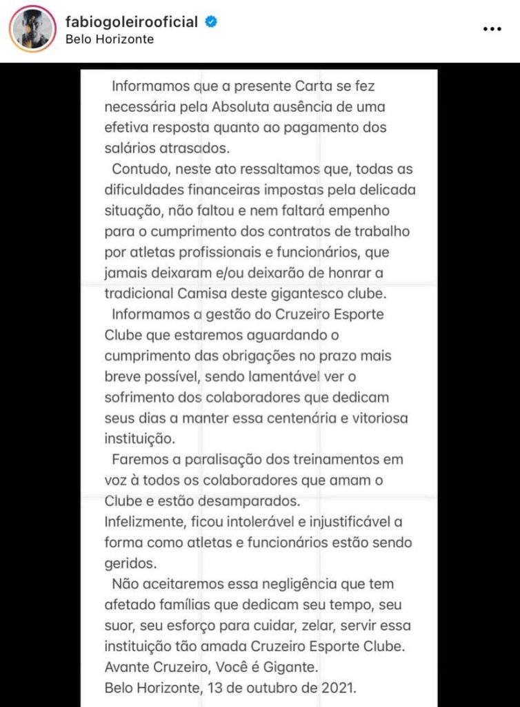 Na carta, Fábio afirma que os jogadores não deixaram e não vou deixar de honrar a camisa do Cruzeiro por respeito aos toredores.
