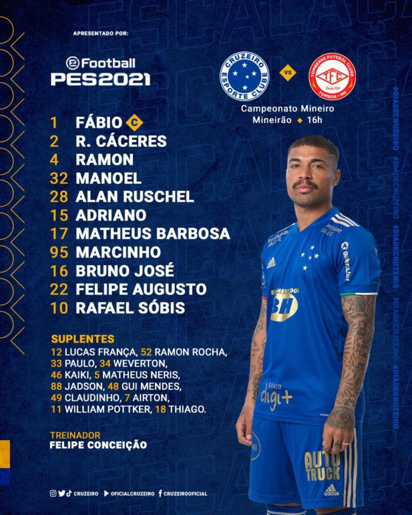 O Cruzeiro está pronto para o duelo com o Tombense pelo Campeonato Mineiro. A partida marca o retorno do Campeonato Mineiro após dez dias suspenso por determinação do Governo de Minas. Então, o técnico Felipe Conceição divulgou a escalação do time, através do Twitter oficial do clube.