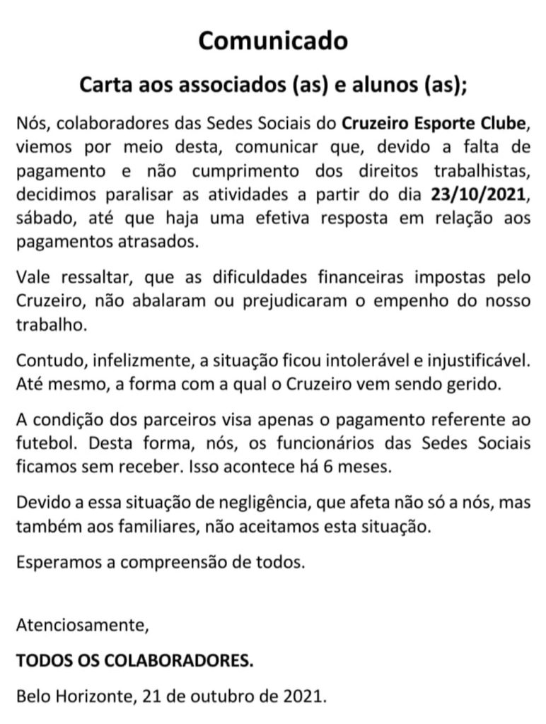 “Infelizmente, a situação ficou intolerável e injustificado. Até mesmo a forma com a qual o Cruzeiro vem sendo gerido” disseram os funcionários em nota.