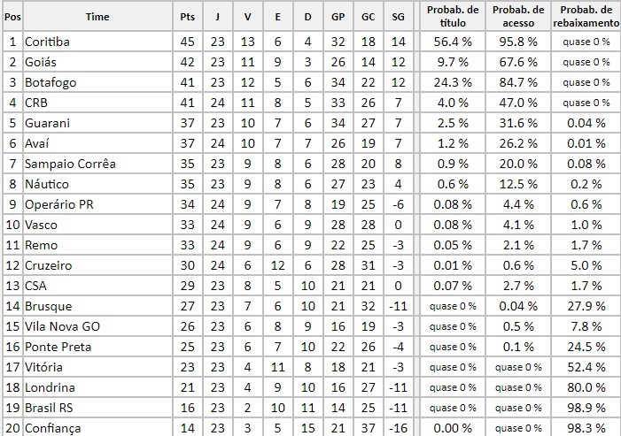 O site chance de gol atualizou neste sábado, após mais alguns jogos da 24ª rodada da Série B do Campeonato Brasileiro terem sido realizados nesta sexta-feira. No entanto, os times já tem suas probabilidades atualizadas.