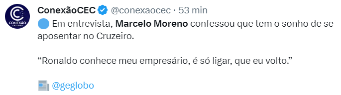 Em entrevista ao GE, Marcelo Moreno, que atualmente joga no Independiente Del Valle, mostrou o desejo de encerrar a carreira no Cruzeiro e ainda aproveitou para mandar uma mensagem direta a Ronaldo que deixou os torcedores do Cabuloso.