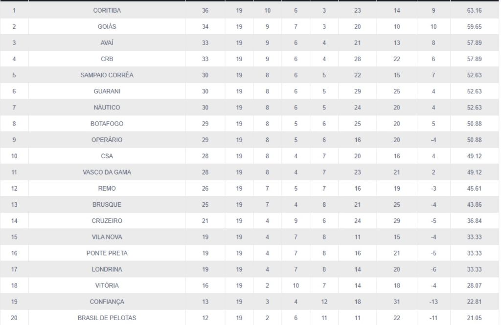 Por outro lado, os últimos times são: Londrina, Vitória, Confiança e também o Brasil de Pelotas na competição nacional, que apresentam as piores campanhas no turno da competição.