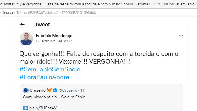 A saída e Fábio do Cruzeiro não agradou nem um pouco o torcedor cruzeirense. O jogador é visto como o maior ídolo recente do clube e na história é sempre colocado ao lado de gigantes, como Tostão e Dirceu Lopes.